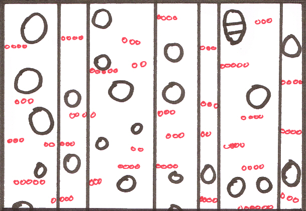 Vessels are represented by circles, rays by vertical lines and parenchyma by red areas.
