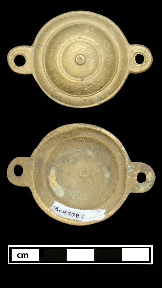 Description: Plain dome with a nipple at center, and rounded rivet tabs. Two raised concentric circles are incised on the dome; one about ¼” from the rim, and the other about ¼” from the center. Cross-section Type III