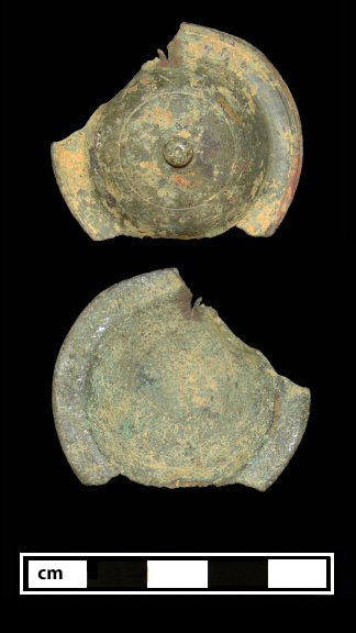 Description: Fragmentary plain dome with a nipple at center and a thin concentric circle incised about halfway up the dome. Cross-section Type I. Rivet tabs are missing.