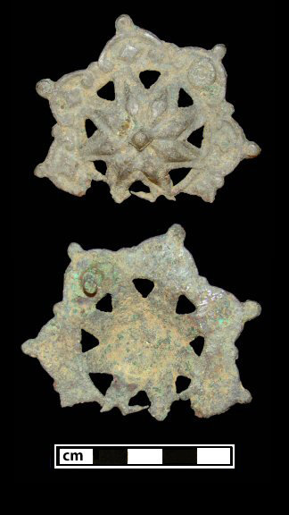 Site: 18CV60 Angelica Knoll Context: N/A (See Site Summary) Site Date Range: c. 1650-1770 Metal: Copper alloy Diameter/Length: 2.6” (6.5 cm) Height (star center to back): 0.5” (1.3 cm) Description: |