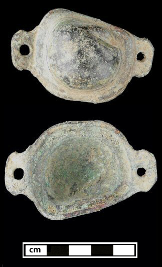Site: 18CV60 Angelica Knoll Context: N/A (See Site Summary) Site Date Range: c. 1650-1770 Metal: Copper alloy Length (including tabs): 2.6” (6.7 cm) Diameter: 2.0” (5.0 cm) Height (dome top to back): 0.6” (1.6 cm) Description: