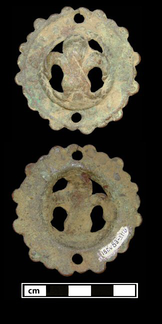 Site: 18CV83 King’s Reach Context: Lot 446, Unit 211D, Plowzone over the shed area attached to the main dwelling. Site Date Range: c. 1689-1711 Metal: Copper alloy Diameter: 2.3” (5.8 cm) Height (top to back): 0.5” (1.3 cm) Description: