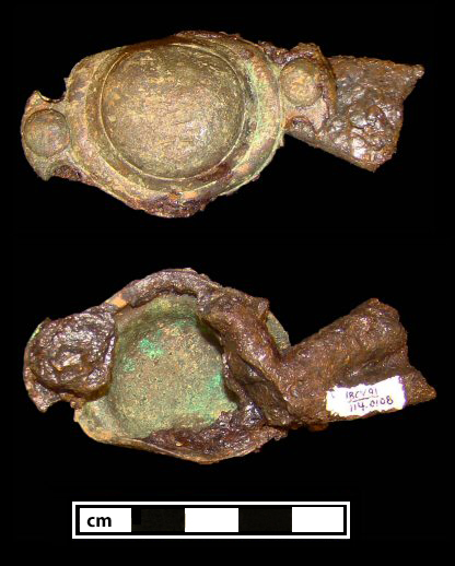 Site: 18CV91 Smith’s St. Leonard Context: Lot 114, Unit 6749, Layer B, Trash pit between a slave quarter and possible kitchen that was filled in one mid 18th-century episode. Context Date Range: c. 1745-1755 Metal: Copper alloy boss attached to an iron curb bit fragment with copper alloy rivets Length (including tabs): 2.4” (6.0 cm) Diameter: 1.6” (4.2 cm) Height (dome top to back): 0.5” (1.2 cm) Description: |