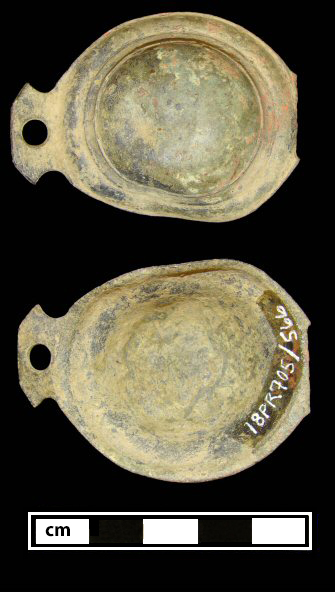 Site: 18PR705 Pleasant Prospect Context: Lot 566, Unit 17, Feature 17, 0-10 cmbs. Feature 17 is interpreted as a sheet midden from an unidentified domestic structure not far from the main plantation house. It might be an overseer’s residence or slave quarter. Context Date Range: c. 1720-1750 Metal: Copper alloy Length (including tabs and assuming that both tabs were equal): 2.1” (5.3 cm) Diameter: 1.7” (4.4 cm) Height (dome top to back): 0.5” (1.3 cm) Description: