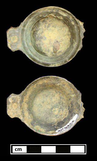 Context: Unit 641, Level A, Plowzone over two possible postholes and a c. 1720-1775 primary refuse deposit. Site Date Range: c. 1720- Present Metal: Copper alloy Length (including tabs and assuming that both tabs were equal): 2.3” (5.0 cm) Diameter: 1.6” (4.1 cm) Height (dome top to back): 0.6” (1.54 cm) Description: