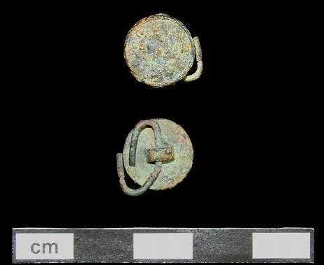 Cast copper alloy button with an unidentified motif. Corrosion has heavily