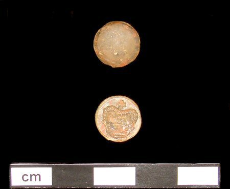 Description: Clear glass button inset. The back bears a molded crown pattern and what appears to be red paint. The front has a slight dome shape and is worn and scratched so that the design no longer shows through very well.