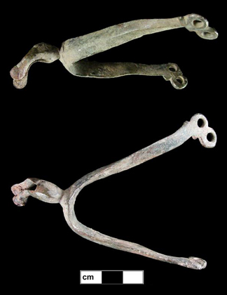 Site: 18CV279 Compton Context: Lot 168.016, Feature 3, Context Date Range: c. 1651-1665 Metal: Copper alloy Arm Length: 3” (77 mm) Neck Length: ~1.4” (30 mm) Rowel Box Length: ~0.9” (23 mm) Rowel Box Width: 0. 2” (5 mm) Rowel Diameter: <1.7” (< 43 mm) Description: |