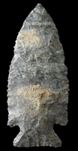 The Kirk Corner Notched point has a large triangular blade with bifacially serrated edges, corner notches, and a straight base.