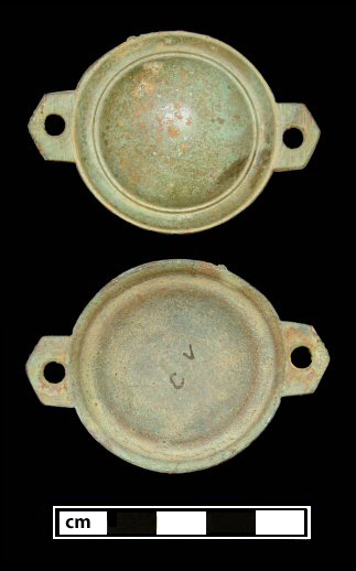 Site: 18AN39 Saunders Point Context: Cellar Fill Context Date Range: c. 1700-1790s Metal: Copper alloy Length (including tabs): 2.4” (6 cm) Diameter: 1.7” (4.3 cm) Height (dome top to back): 0.5” (1.2 cm) Description: |