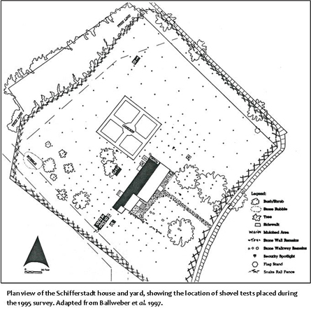 When the FCLC purchased the Schifferstadt house, archaeological and architectural surveys were undertaken to assist plans for its rehabilitation. A number of test units were excavated under the structure and in its immediate outer vicinity to assess disturbance and collect information prior to new construction efforts. Additional shovel tests were placed in the yard prior to the addition of a new underground power line in 1975. Two field schools also tested the yard area in the 1980s, though little information is available about findings from these efforts.