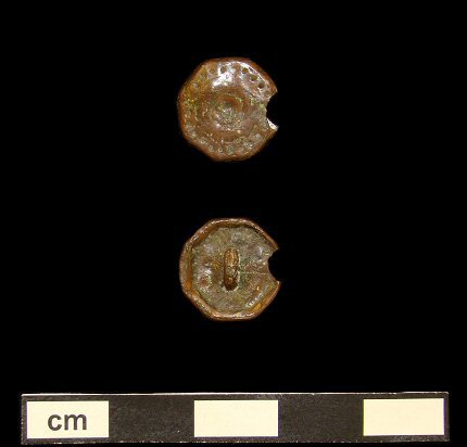 Description: Octagonal-shaped button with impressed dots around the edge and a few impressed rings to decorate the center. This button is very use-worn.