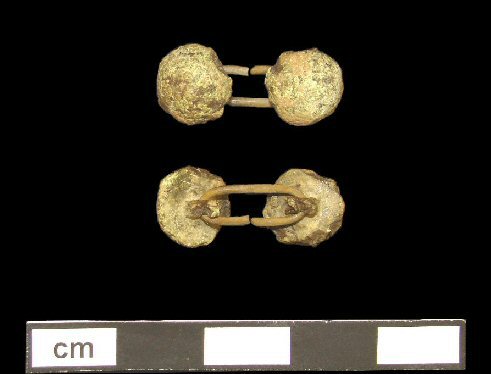 Plain domed copper alloy buttons with a copper alloy link. The buttons are heavily corroded and exhibit many cracks.