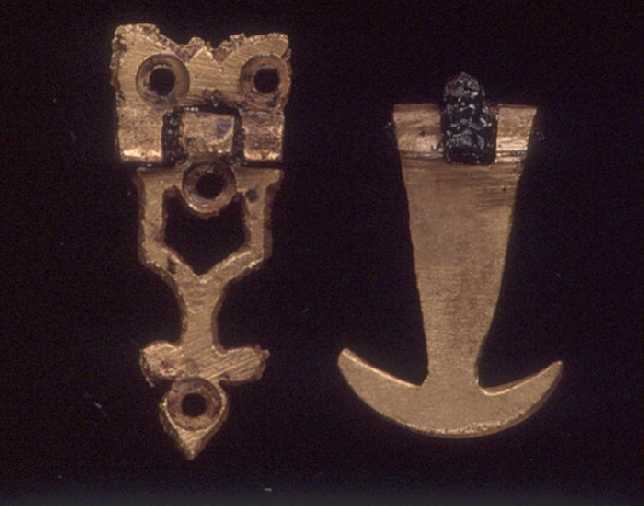 18CV83 - 261.001, 575.001 COPPER ALLOY BOOK HINGE (LEFT); COPPER ALLOY BUCKLE ANCHOR CHAPE (RIGHT)