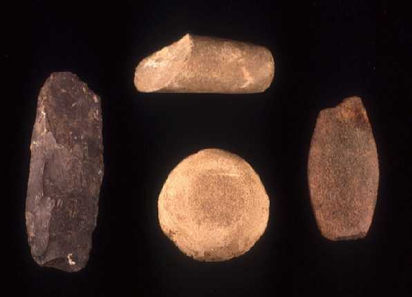 18CV91 NATIVE AMERICAN RHYOLITE BLADE, PESTLE FRAGMENT, GORGET, AND ABRADER