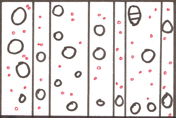 Vessels are represented by circles, rays by vertical lines and parenchyma by red areas.